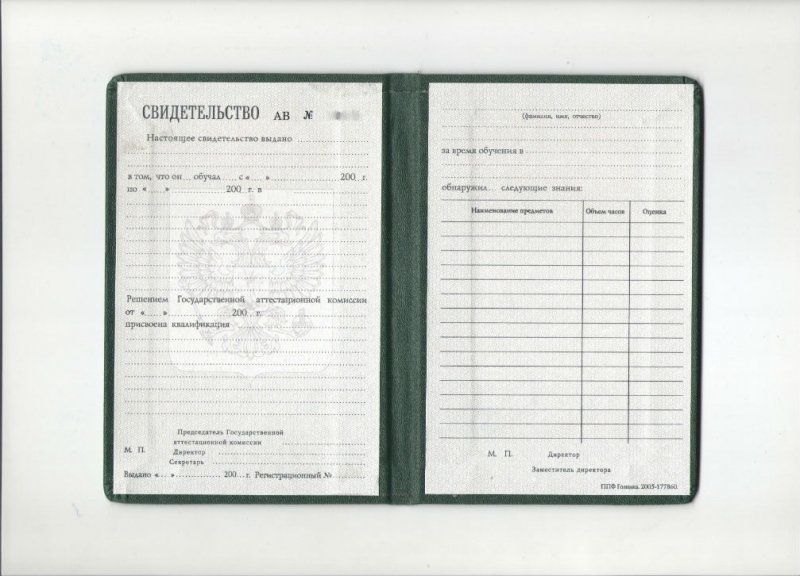 • Документ: Свидетельство о профессиональном образовании (ПТУ)